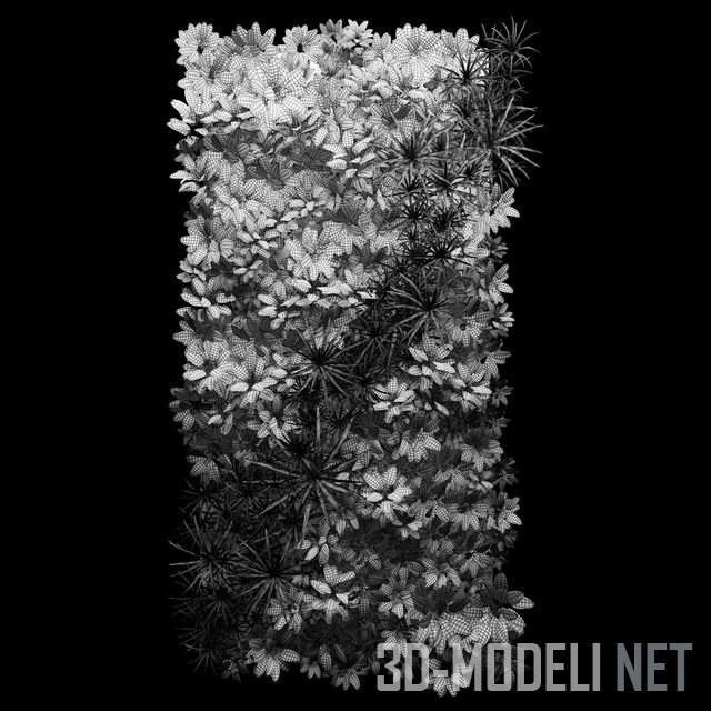 Вертикальный декоративный фитомодуль с растениями трех видов. На фоне зеленых растений яркими динамичными линиями выделяются группы кротонов с желтой доминантой в окраске листьев. Фитостены с успехом используют для декора современных интерьеров общественных и частных помещений в соответствующем стиле.