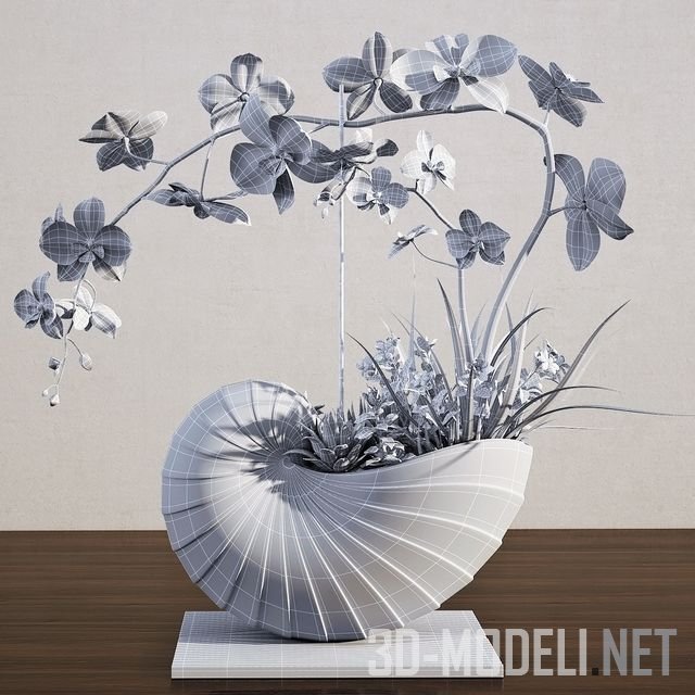 Белоснежная раковина, из которой растет крупная орхидея с яркими красными цветками и мелкие нежные голубые незабудки, станет изысканным декоративным элементом в интерьере.