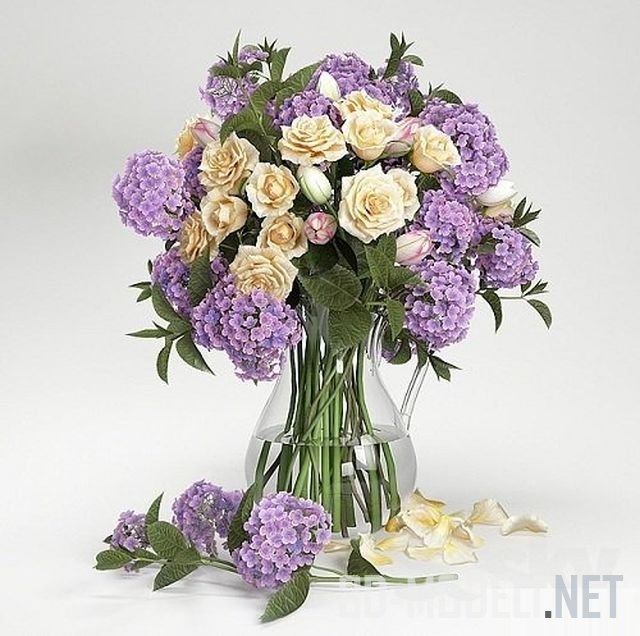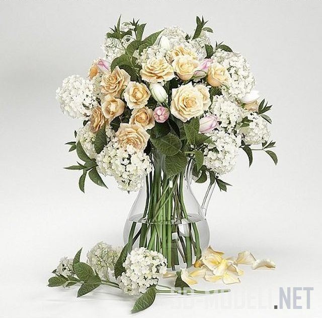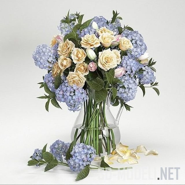 Пышный букет, составленный из цветов гортензии и роз. Показан в разных цветовых вариантах.