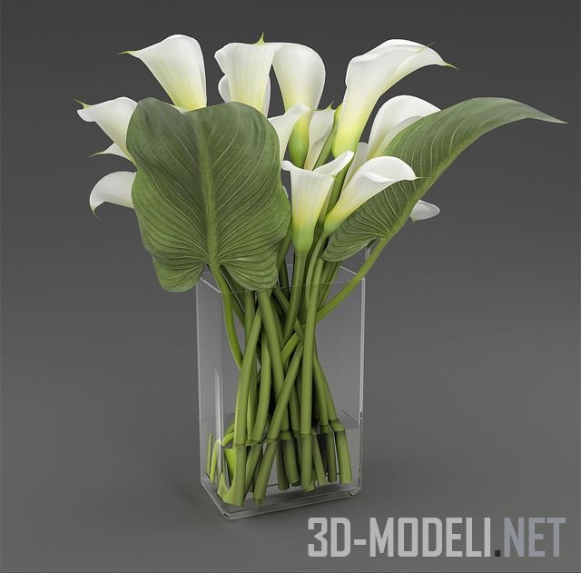 Реалистично выполненная трехмерная модель букета цветов: каллы в вазе из прозрачного стекла.