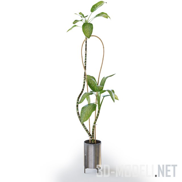 Крупный домашний цветок с большими пестрыми листьями в небольшом серебристом горшке. Благодаря своему декоративному виду дифенбахия всегда хорошо смотрится в интерьере помещения.