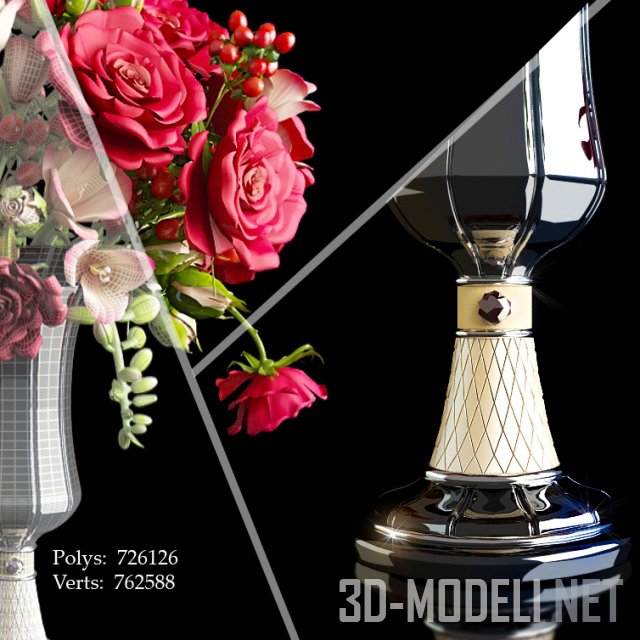 Большой букет из алых роз в узкой сверкающей вазе с декором. Такой букет хорошо использовать при разработке интерьера гостиной или спальни в классическом стиле. Реалистичная модель с текстурами в архиве.