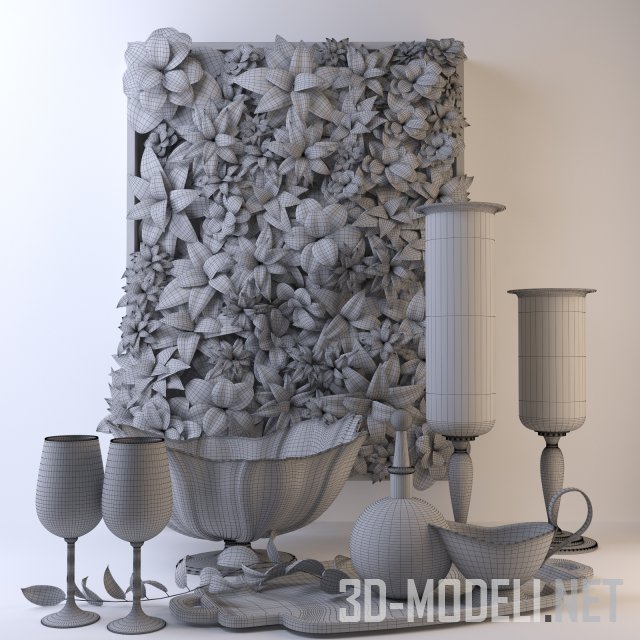 Небольшое цветочное панно с зелеными и красными цветами, возле которого стоят прозрачные стеклянные бокалы различной формы. На сверкающем мельхиоровом подносе стоит графинчик с напитком и соусник.