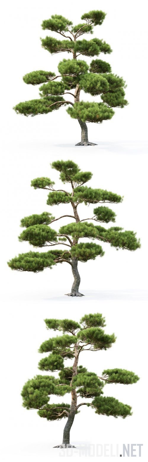 Pinus sylvestris Bonsai, сосна бонсай обыкновенная. Вечнозеленое дерево, с характерной формой кроны в виде густых шапок на верхушках ветвей. Реалистичная 3d модель, высота дерева 4,5 м. Текстуры в архиве.