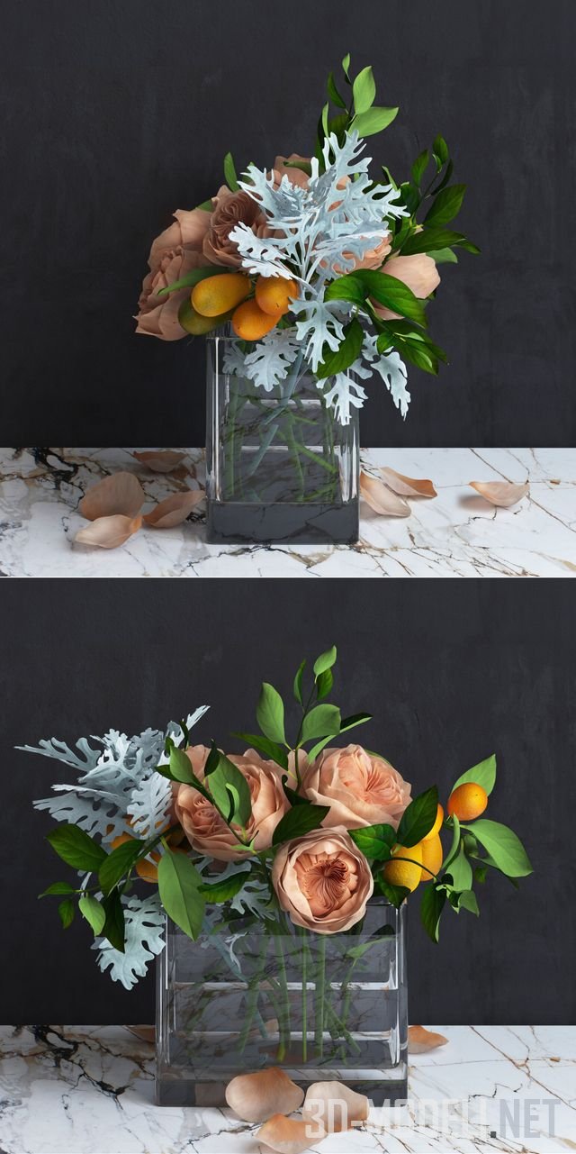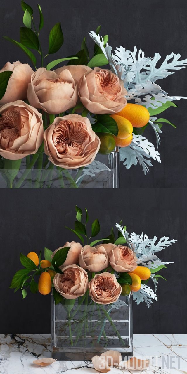 Ветви кумквата и ветки Dusty Miller (крестовник пепельный, или Якобея приморская) являются отличным дополнением к розам, носящим имя Дэвида Остина. Букет в стеклянной вазе, все смотрится очень реалистично. Архив содержит все текстуры. Все материалы имеют правильные названия. Все оси расположены в нужных местах.