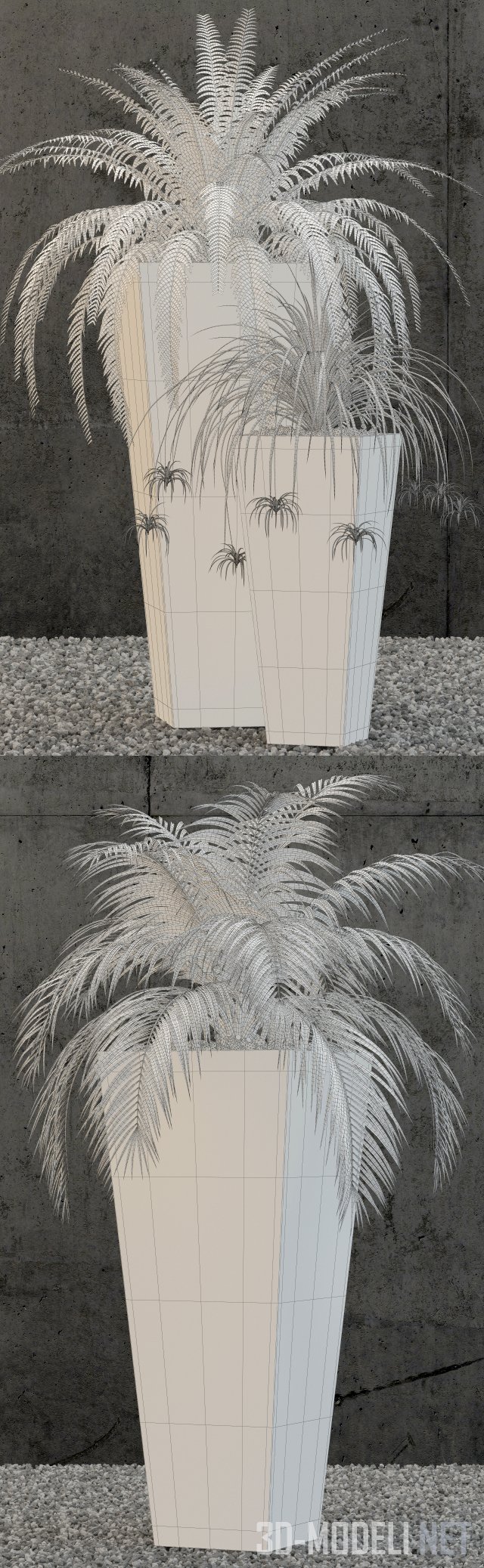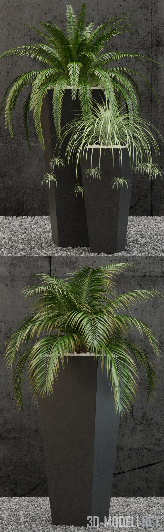 Разной высоты крупные цветочные контейнеры от Restoration Hardware SALENTO TAPERED PLANTERS, с растениями. Черный матовый пластик горшков прекрасно гармонирует с белой галькой на верхнем слое грунта и пышной зеленью пальмы, папоротника и хлорофитума, соответственно растущих в крупной, средней и меньшей вазах.