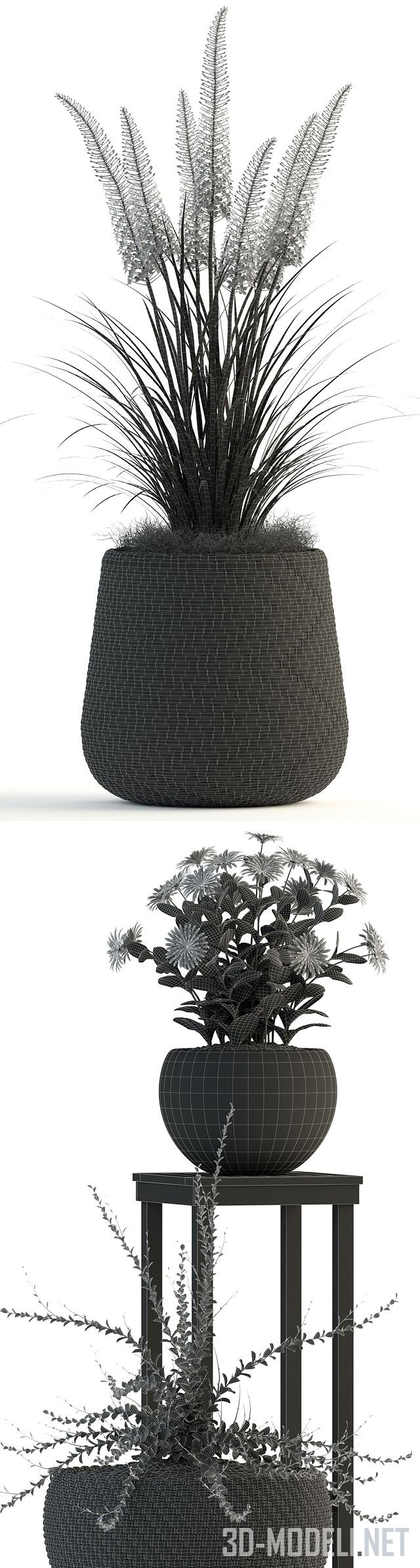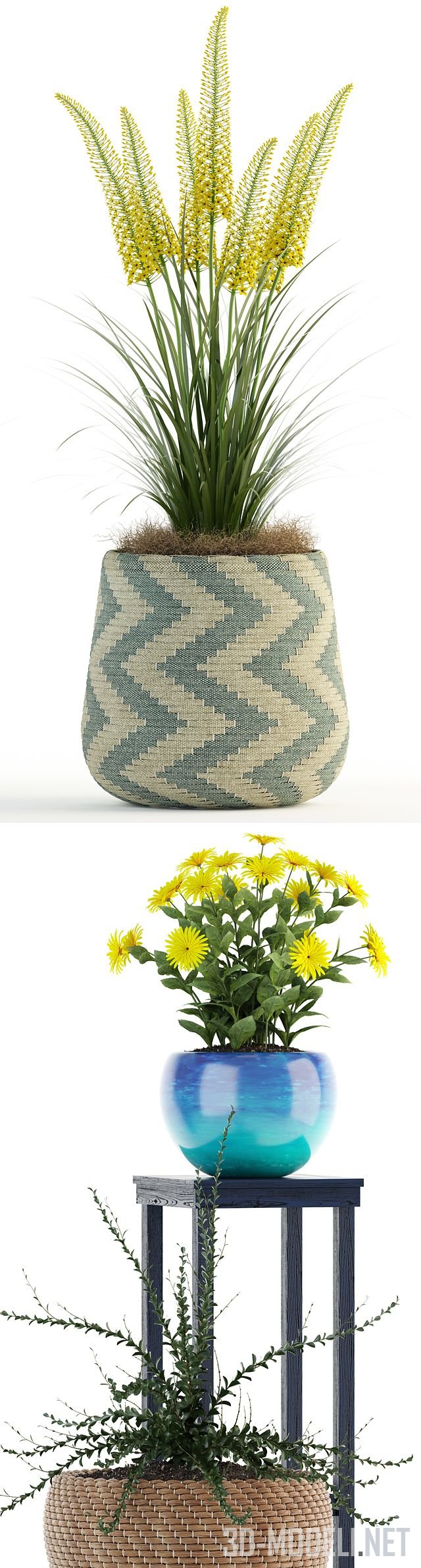 Желтый эремурус (ширяш) с высокими крупными соцветиями, напоминающими початок кукурузы, желтые хризантемы и небольшой молодой раскидистый куст с темно-зелеными мелкими листьями. Растения высажены в крупных горшках с разной отделкой в этно-стиле.