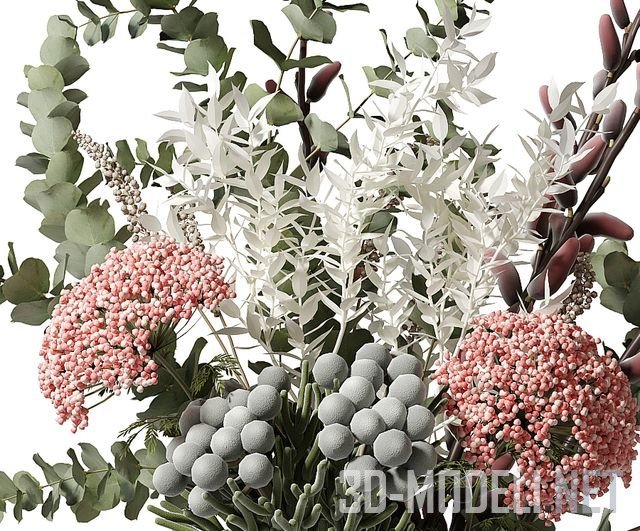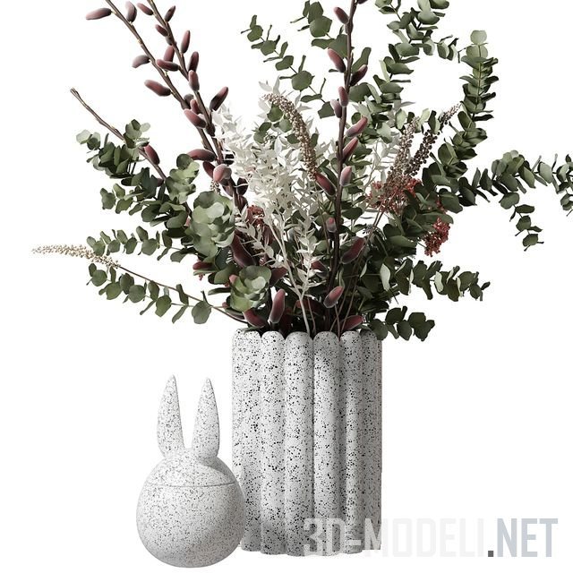 Оригинальная белая ваза, словно собранная из удлиненной версии печенья савоярди, с букетом, в котором доминируют зеленые ветки эвкалипта. Рядом находится ваза с крышкой, имитирующей заячьи уши.