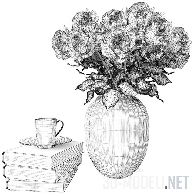 Эстетичный набор предметов, который сделает интерьер романтичней и интересней. Это букет белых роз, который отлично смотрится в вазе из синего стекла. Цветы дополнены книгами и чашкой.