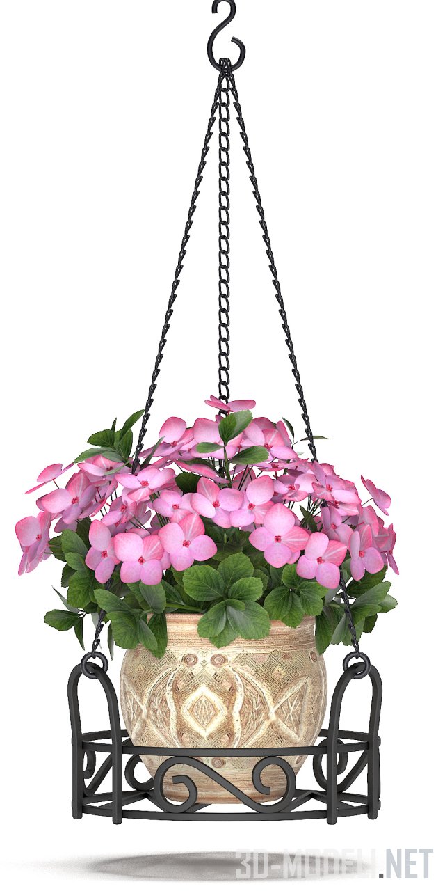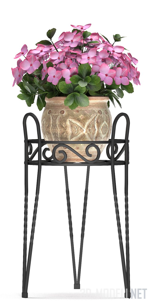 Комнатное растение с розовыми цветами в керамическом горшке. Горшок размещен на трехногой кованой подставке. Бортик подставки украшен S-образными коваными элементами.