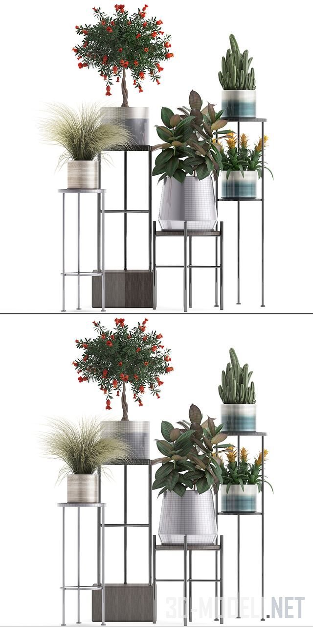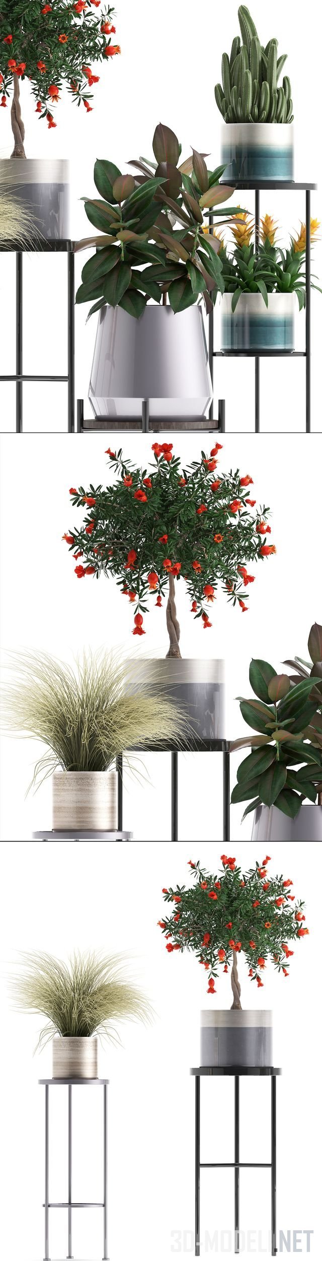 Экзотические комнатные растения на высоких подставках: бромелия, Фикус эластичный, фикус робуста, кактус, Tussock (трава) и цветущее гранатовое дерево. Такие растения украсят любой современный интерьер, придав ему живость и уют.