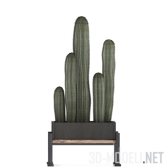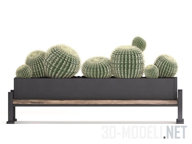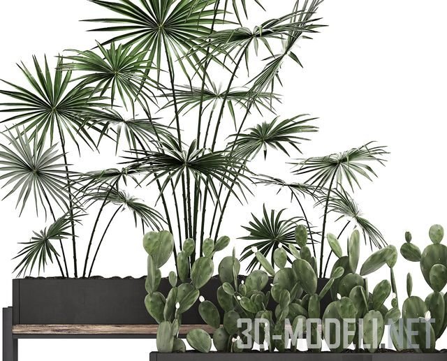 Четыре прямоугольных разновысоких контейнера графитового цвета с горизонтальной деревянной вставкой с комнатными растениями. В контейнерах: пальмы кокотринакс и хамеропс, кактусы опунция, карнегия гигантская (Сагуаро), колоновидный, эхинокактус.