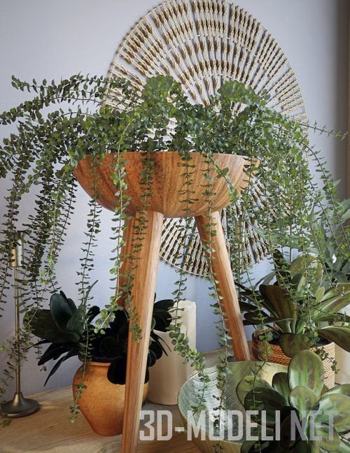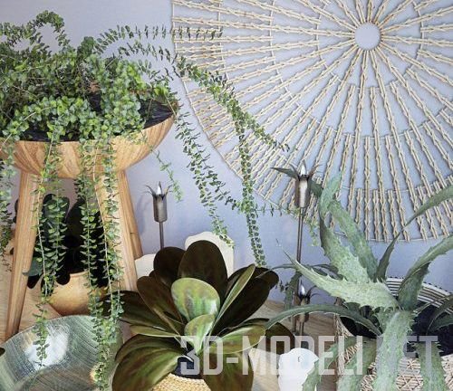 Несколько цветочных кашпо, изготовленных в характерном этно-стиле, а также декоративное круглое панно формируют красивую растительную композицию. Панно, солярный символ, изготовленный из тонких белых элементов, закрепленных на кольцах разного диаметра, составляет центр представленной композиции. Толстые белые свечи и несколько кашпо, стальные подсвечники в форме цветов и подставка из дерева для комнатных цветов дополняют набор.