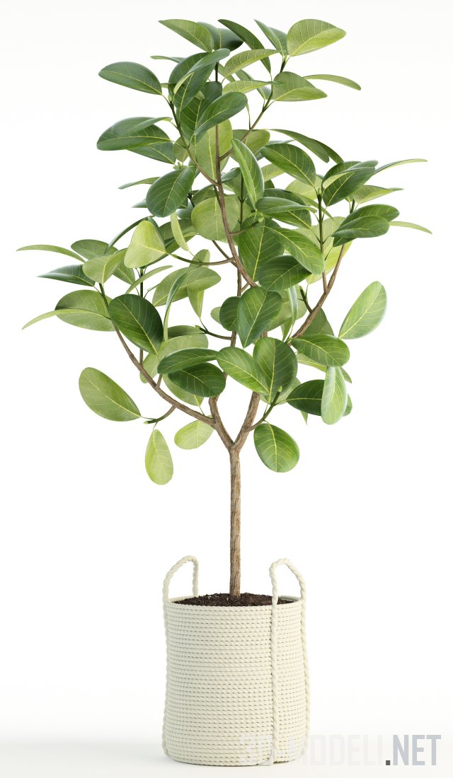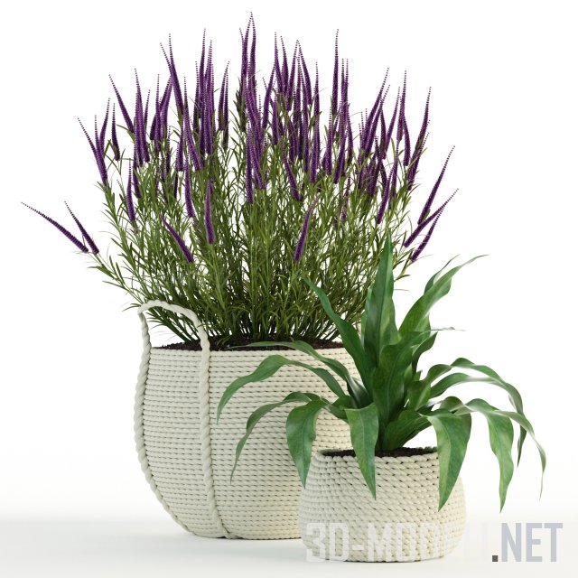 Растения в белых вязаных кашпо с ручками, три варианта комнатных композиций (одно из растений цветущее). Свежий, нарядный и уютный вариант декорирования пространства.