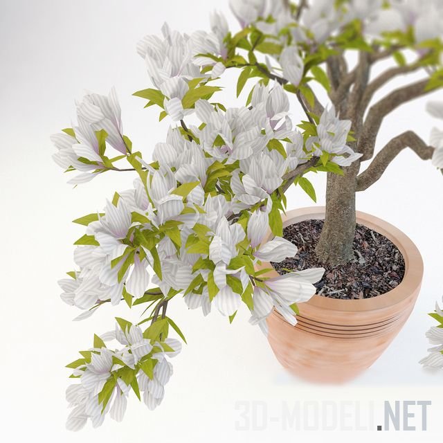 Прекрасная цветущая магнолия (модель Magnolia Soulangeana). Небольшое деревце в глиняном горшке, густо усеянное крупными белыми цветами, в окружении светло-зеленых листьев. Очень хорошо будет смотреться в интерьере зимнего сада и других пространствах.
