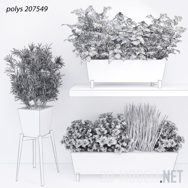 Горшки с пряными травами – сельдерей, базилик, петрушка, лук, тимьян. Травы в белых керамических горшках, стоящих на подставках из светлого дерева.