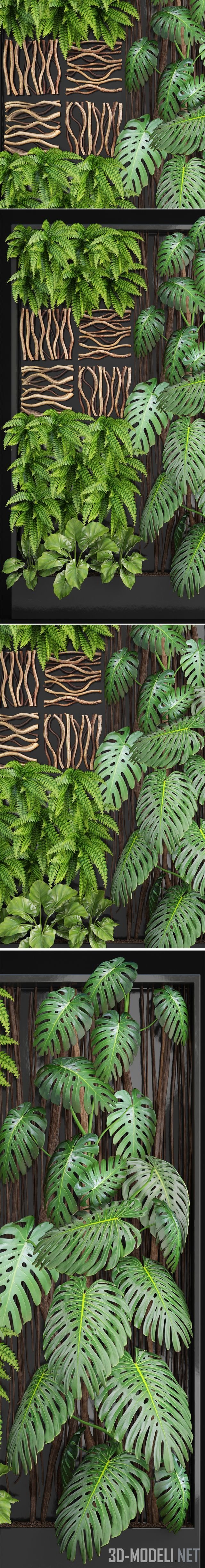 Элемент украшения стен в интерьерах эко-стиля. Панно из плавноизогнутых палочек, собранных группами, формируют квадраты с горизонтальными и вертикальными «волнами». Закрепленные на графитово-черном фоне кусочки веток. Дополнены длинными вертикальными «лианами», оттеняются яркой, сочной зеленью крупных листьев монстеры и кустиков папоротника асплениума. Композиция фитостены обрамлена рамкой из рейки графитового цвета.