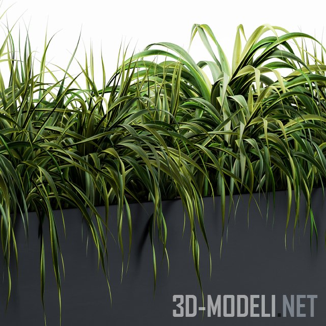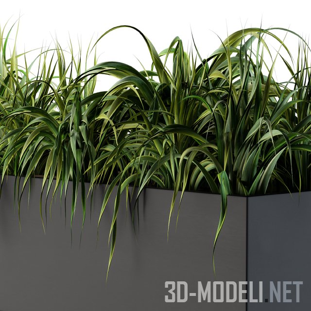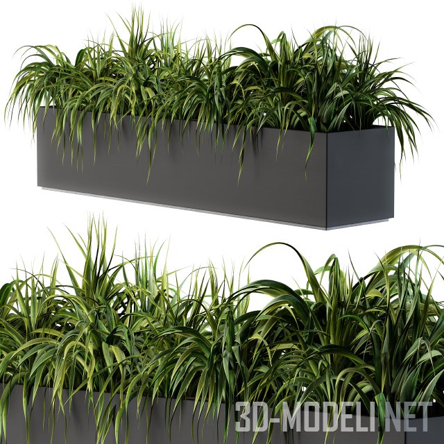 Прямоугольные ящики черного цвета с матовой отделкой Ящики наполнены высокой зеленой густой травой для садовых бордюров.