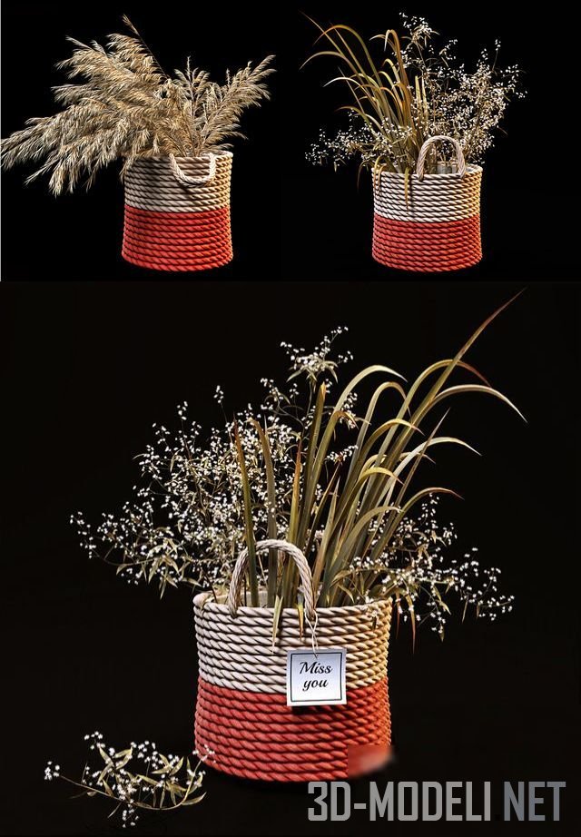 Две плетеные корзинки в сочетании бежевого и красного цвета являются отличной основой для букетов полевых растений и трав. Любая из композиций станет украшением интерьера.