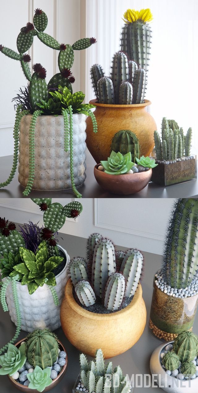 Живописная группа кактусов в различных горшках. В наборе опунция, апрокактус, цветущий трихоцерус и другие. В плоской глиняной миске вместе с небольшим шаровидным кактусом посажены две эхиверии.