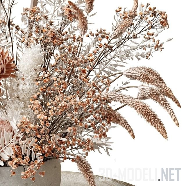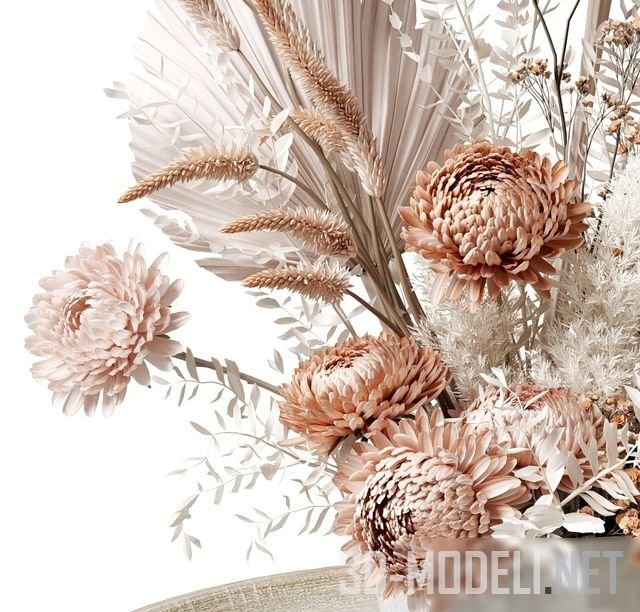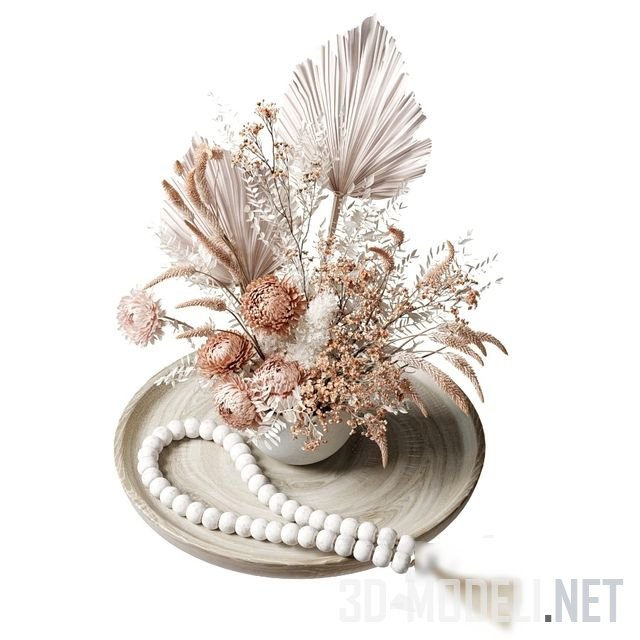 Элегантная, нежная декоративная композиция – это букет из сухих цветов, с хризантемами. Букет стоит в вазе на подносе, разные сухие травы, колоски и цветы красиво сочетаются между собой. На подносе лежат четки.