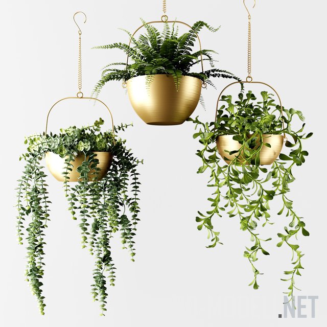 Реалистичная трехмерная модель, три разных ампельных растения, высаженных в бронзовых кашпо. Композиция смотрится очень нарядно и станет однозначным украшением интерьера.