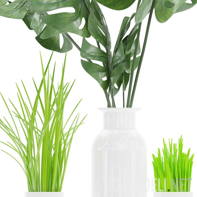 Растительная композиция для декорирования интерьера. С содержит белого цвета вазы с листьями монстеры (1250 мм), травкой (600 мм) и алоэ вера (310 мм).