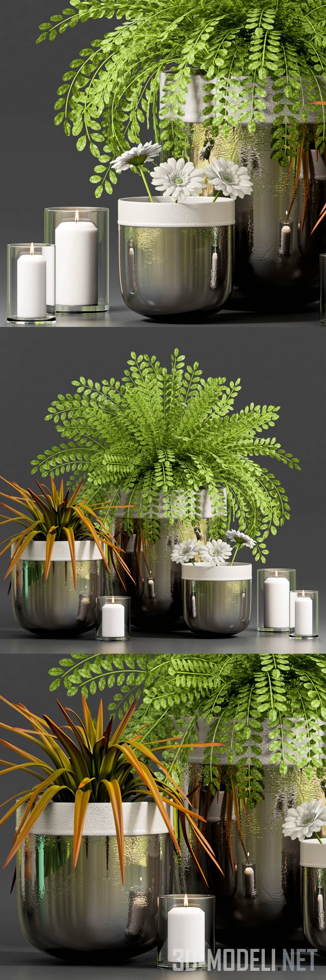 Набор комнатных зеленых растений в красивых, стильных горшках. В одном белые герберы. Белого цвета свечи отлично дополняют сет.