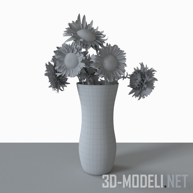 Яркий букет подсолнухов в вазе с жостовской росписью, основным мотивом которой является цветочный букет. Реалистичная трехмерная модель, архив содержит fbx, все текстуры, карты нормалей.