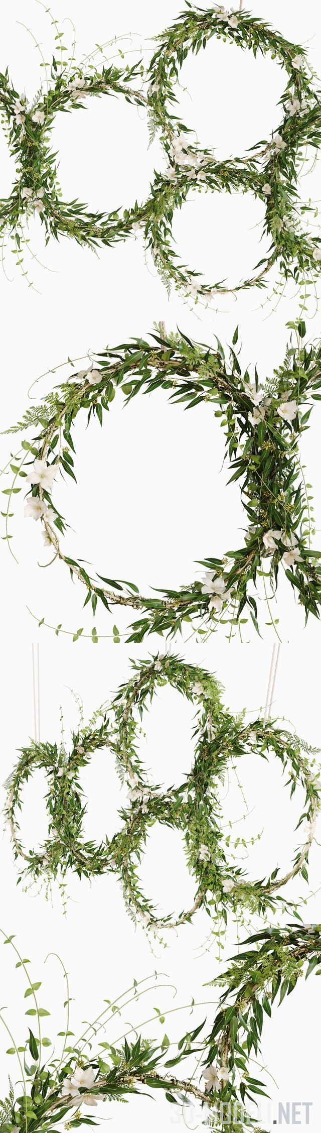 Пять красивых, невероятно нежных декоративных венков. Сплетены из веток с зелеными узкими листьями и белыми цветами. Размер: 700 x 700 x 200 мм.