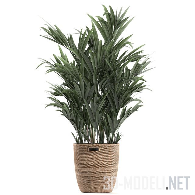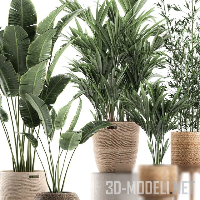 Комнатные экзотические растения в плетеных ротанговых корзинах для декора интерьера. В наборе банановая пальма, Ravenala madagascariensis, ховея, кентия, финиковая пальма, бамбук.