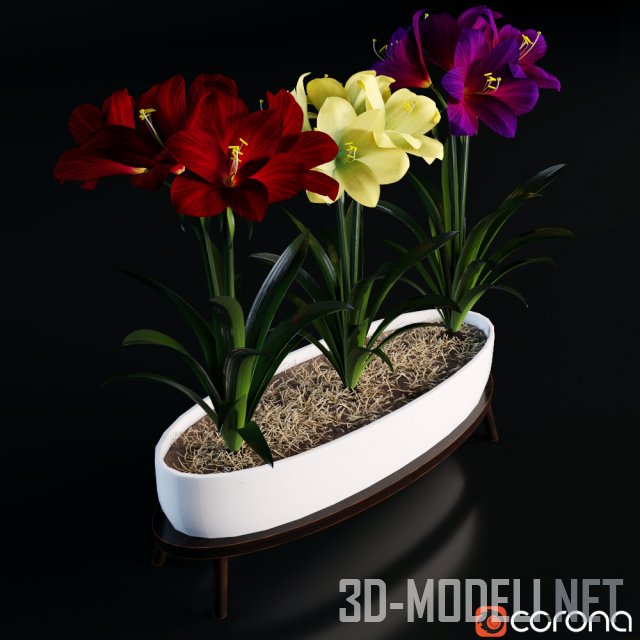 Плоское белое кашпо на маленьких ножках. В кашпо растут три красивых крупных гипеаструма (Hippeastrum) с шикарными крупными гроздьями белых, красных и сиреневых цветов.