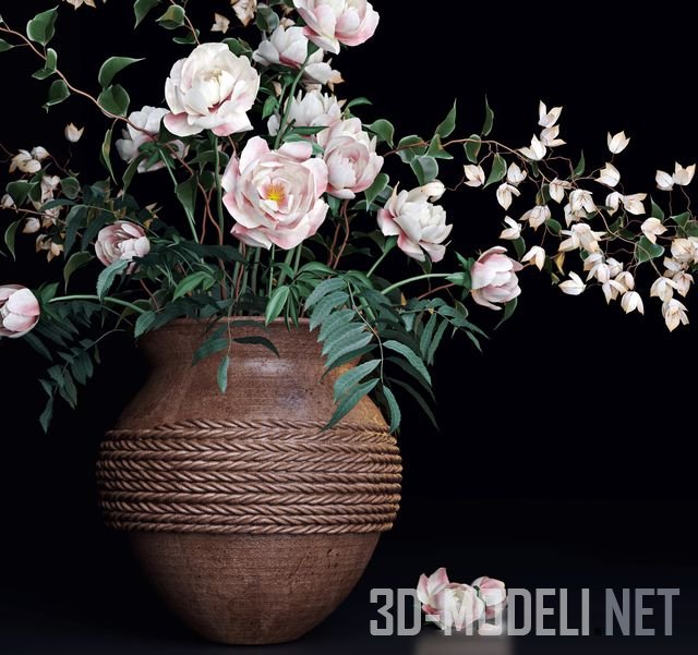 Красивый большой букет из веток бугенвиллии с мелкими белыми цветочками и белых пионов. Букет стоит в глиняном горшке коричневого цвета с декоративным узором косичкой.