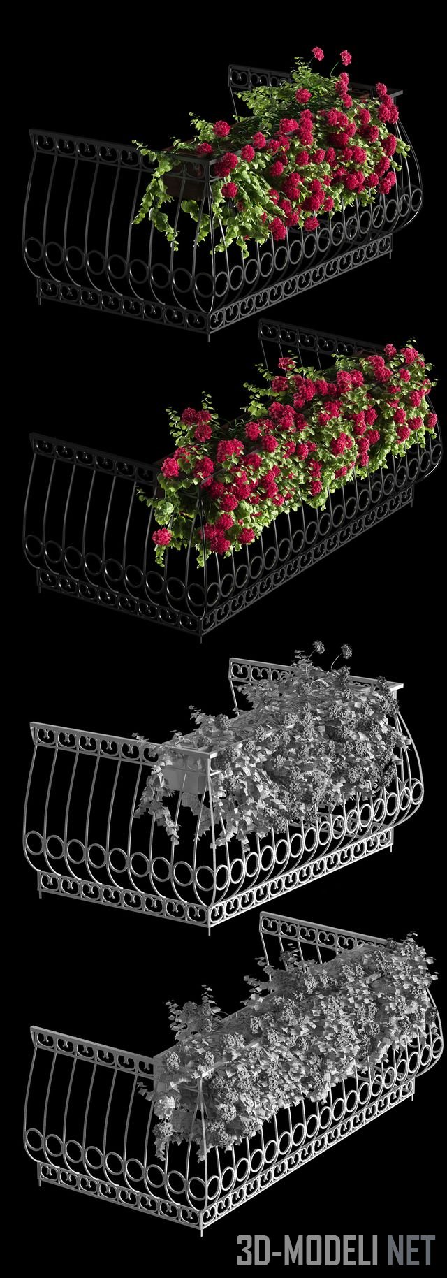 Красивые кованые черные балконы с ящиками. В ящиках красные цветы герани с зелеными листьями. Подойдет для интерьера, уличного использования, кафе, баров, ресторанов, террас, балконов, крыш и озеленения фасадов. Размеры ящиков: 150, 195 см.