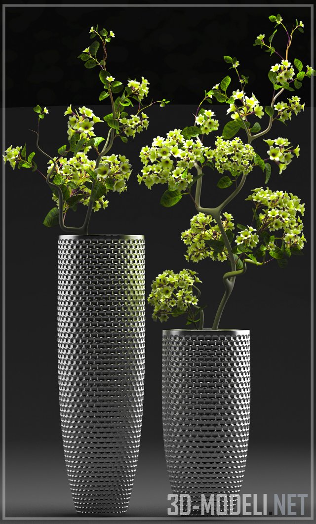 Две высокие вазы с оригинальной рельефной поверхностью, с металлическим блеском. В вазах стоят ветки с зеленоватыми гроздьями цветов.