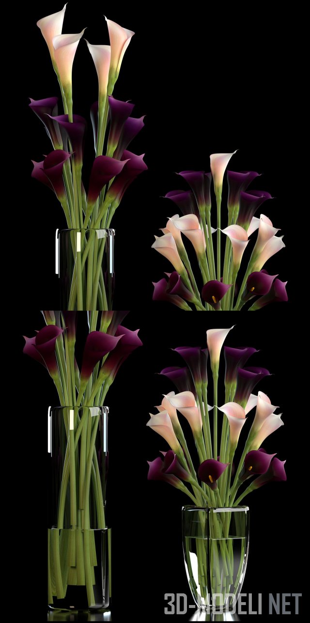 Прозрачные стеклянные вазы с букетами прекрасных калл. Удлинённые цветки пурпурного и белого цвета венчают округлые трубчатые стебли. Можно использовать как декоративные элементы и в современных, и в классических интерьерах.