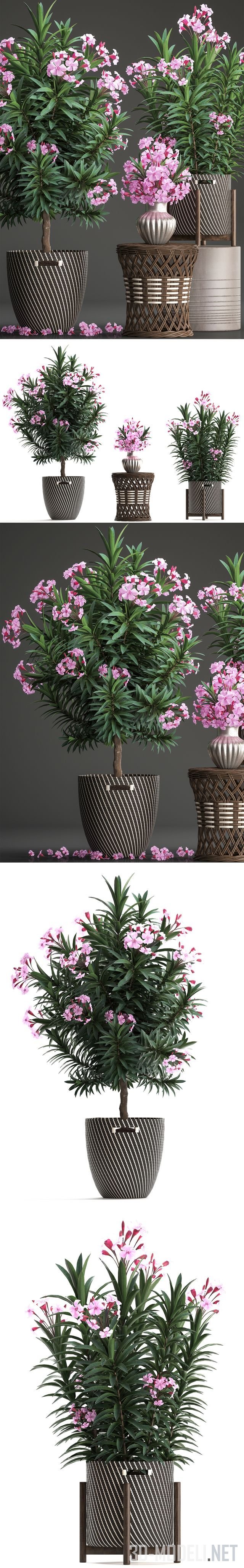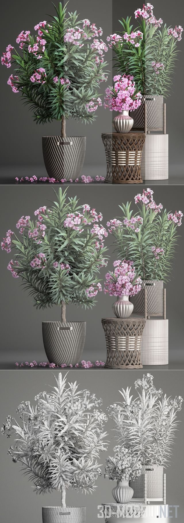 Nerium oleander). Экзотичность растения подчеркнута плетеным из ротанга столиком и отлично подобранными цветочными горшками.