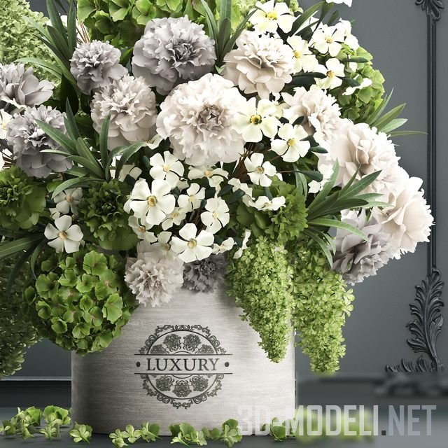 Большой красивый букет в бело-зеленой цветовой гамме. Букет собран из цветов гортензии, пионов, сирени, олеандра. Цветы стоят в подарочной коробке luxury. Композиция отлично смотрится на фоне лепной рамки.