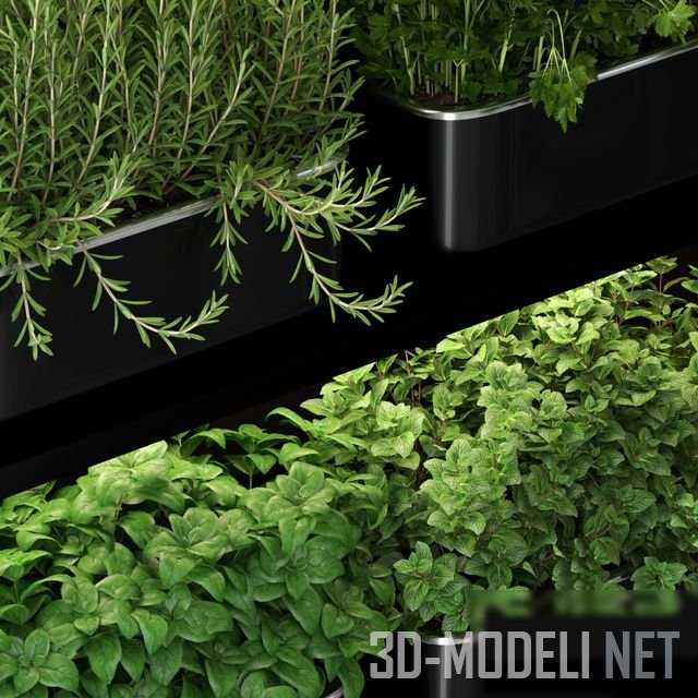 Четыре горшочка с травами для кухни. Петрушка, розмарин, базилик и мята станут отличным дополнением на полке или подоконнике.