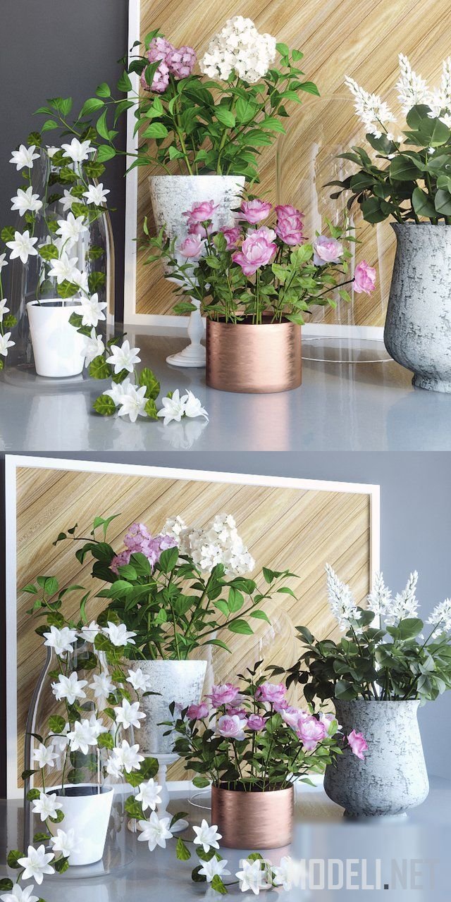 Набор разных цветочных композиций на весеннюю тематику. Различной формы горшки и вазы служат основой для гортензии и других цветов. Модель поможет создать праздничную, весеннюю атмосферу.