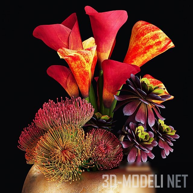 Оранжево-красный букет в вазе. Красно-оранжевые зантедексии (каллы) главенствуют в композиции. Зеленовато-бордовые каменные розы на длинных стеблях и экзотические красно-зеленые цветы поддерживают идею букета. Керамическая шаровидная ваза выкрашена золотистой краской и украшена золотой паталью.