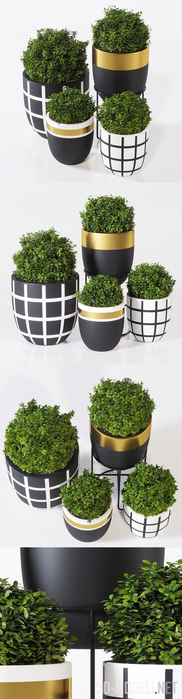 Шарообразные самшиты в декоративных цветочных горшках ROYAL POT и GRID POT от Designtwins. Горшки в сочетаниях графитового и белого (в коллекции GRID) и графитового с золотым (в коллекции ROYAL). Один из горшков на металлической подставке IVY MUSE CHAMELEON. Три типоразмера горшков: d34xh35, d41xh43, d51xh50см.