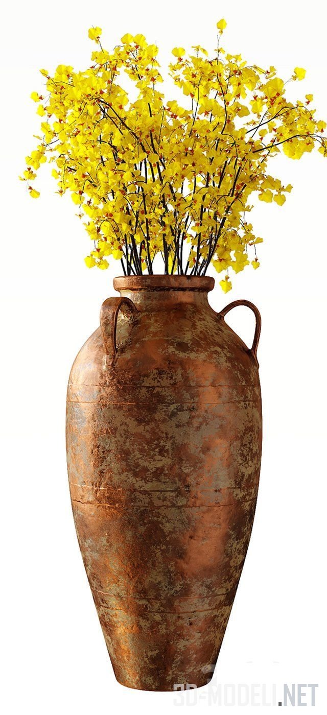 гидрия) с орхидеями. Ваза с рустикальной бронзовой паталью на поверхности и с тремя ручками. Высота вазы 70 см. Густой букет онцидиума - с мелкими желтыми цветками и темно-красными срединками.
