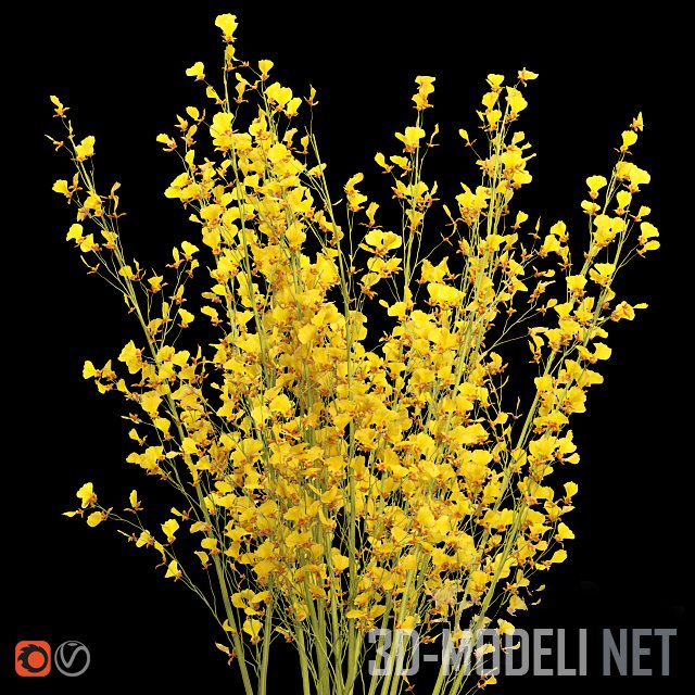 Большой букет из веток орхидеи-онцидиума с мелкими желтыми цветками. Букет размещен в цилиндрическую вазу прозрачного стекла.
