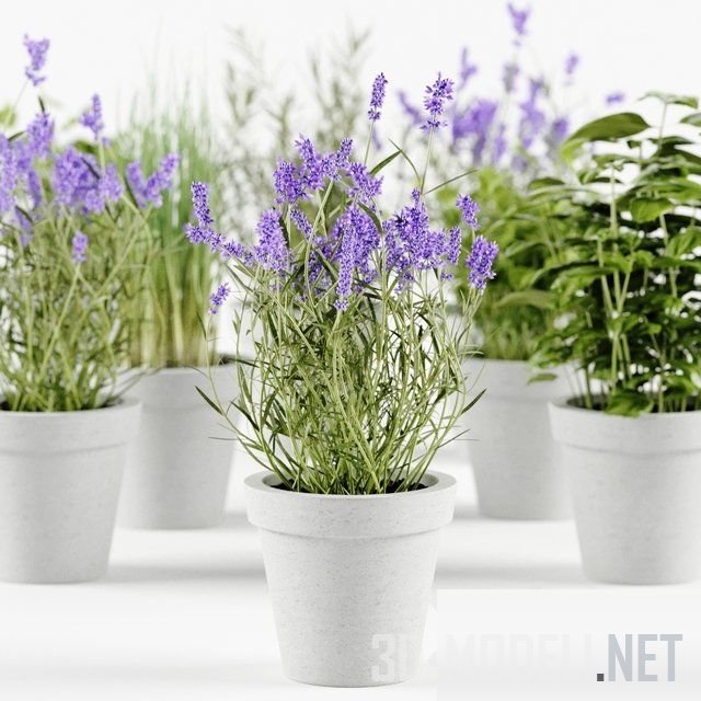 Несколько небольших цветочных горшочков из искусственного бетона светло-серого цвета. В горшках - молодая зелень орегано, лемонграсса, кинзы, цветущей лаванды.