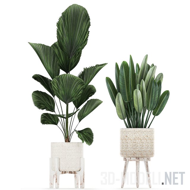 Четыре экзотических плетеных горшка на подставках и без с высокими тропическими растениями. Горшки и деревянные подставки отделаны потертыми рустикальными белилами. Растения в горшках: калатея сигарная (Calathea lutea), пальма ликуала (licuala arbuscula), стрелиция (Strelitzia), равенала (Ravenala madagascariensis), ховея (Howea forsteriana).