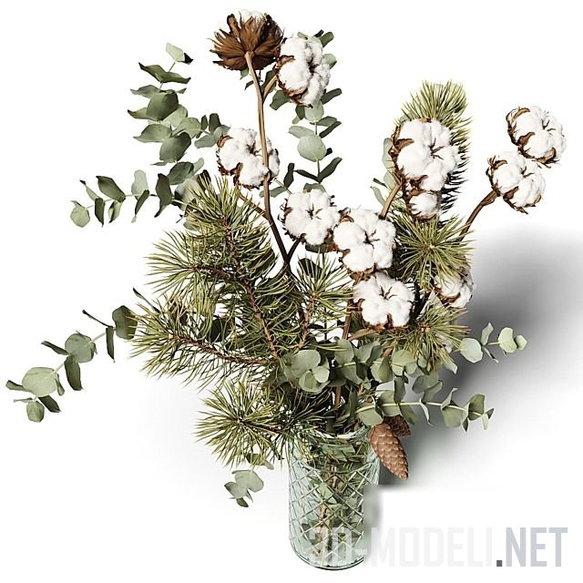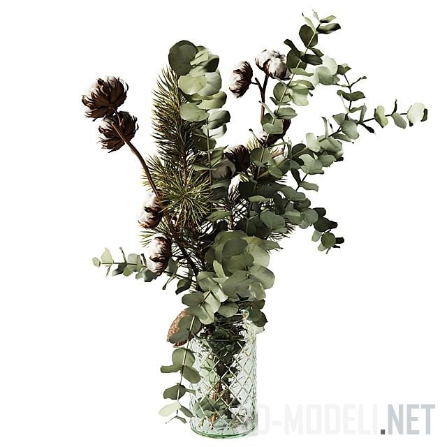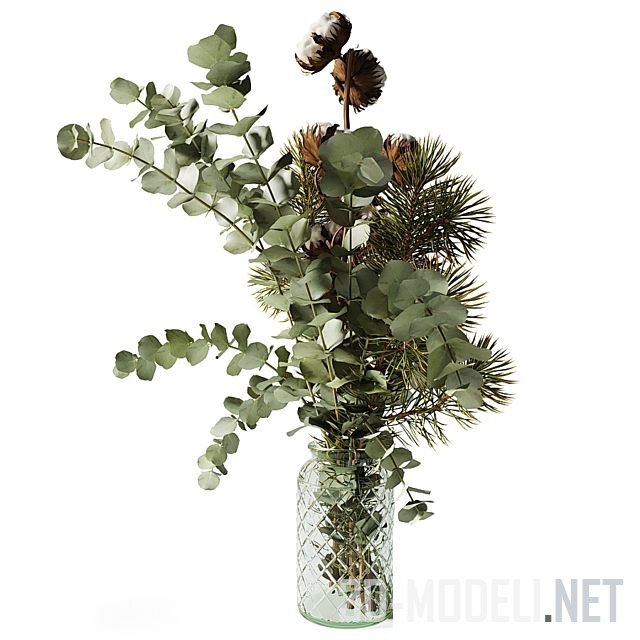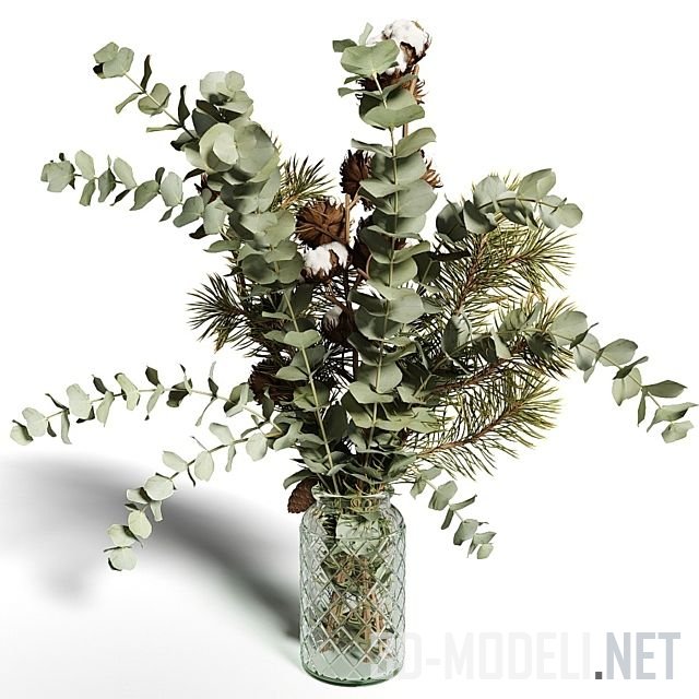 Красивый зеленый, полезный букет, в котором ветки сосны с шишками, зеленый эвкалипта и коробочки хлопка органично сочетаются между собой. Букет в стеклянной вазе с рифленым узором.