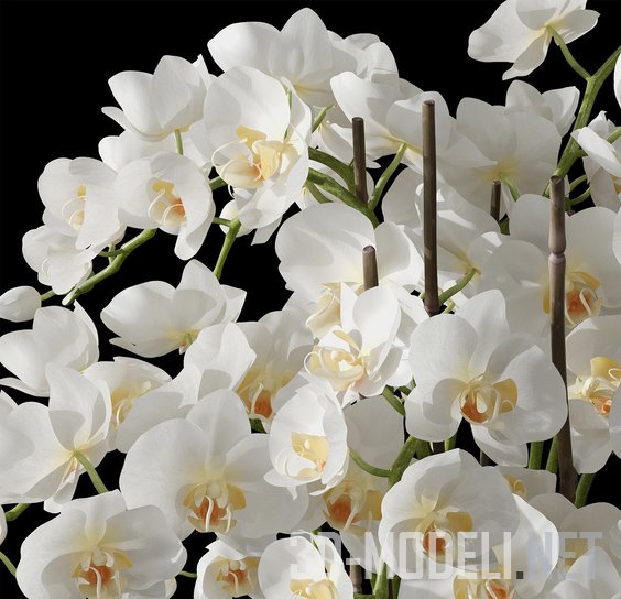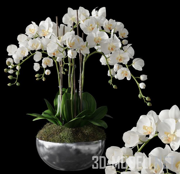 Пышные цветущие фаленопсисы в низких горшках из темного металла. Белые цветущие орхидеи прекрасно контрастируют с рустикальной металлической поверхностью горшков. Поверхность грунта декорирована мхом.