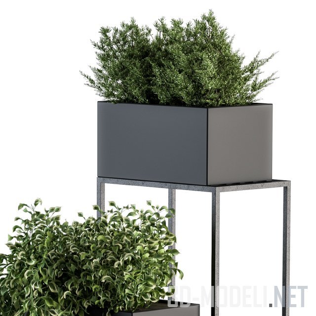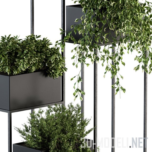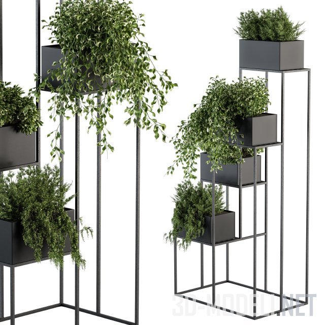 Стильная подставка для домашних растений. Представляет собой единый стенд из покрашенного в черный металла, на разных уровнях которого размещены контейнеры, тоже черного цвета. В контейнерах зеленые растения.