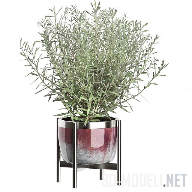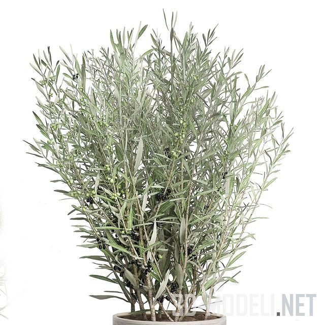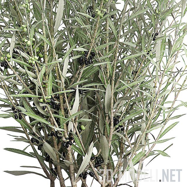 Оливковые деревья в формате кустов в крупных цветочных горшках. Один горшок - глянцевый на четырехногой металлической подставке. Второй декорирован под шпон дерева с сероватой текстурой и металлической нижней частью. На ветках оливы - зеленые и черные ягоды.